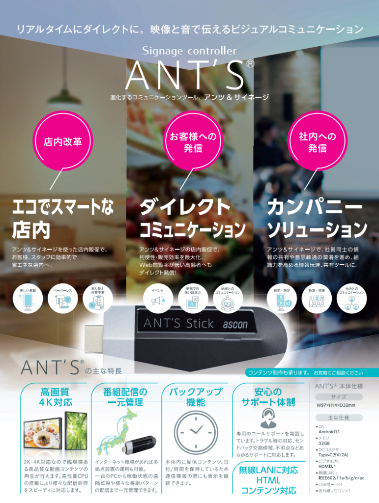高画質4K対応・HTMLコンテンツ対応のサイネージコントローラ『ANT'S Stick』の紹介です。